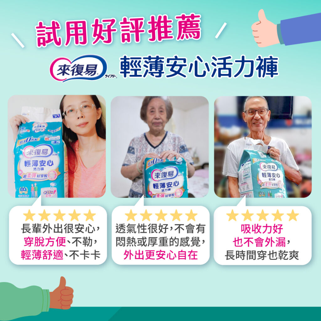 為了幫助長輩克服漏尿帶來的不便,「來復易輕薄安心活力褲」從細節出發,打造舒適又安心的穿著體驗。輕薄透氣,如同穿內褲般自然舒適,穿上也不易被察覺;搭配升級+25%柔軟的超柔彈性腰圍,長輩只需輕輕一拉就能輕鬆穿上,貼合腰部曲線、不勒緊,自主如廁不需他人協助。薄型高吸收體搭配柔貼防漏側邊,輕薄卻能穩妥鎖住約2次尿量,追求0外漏;再加上Ag+消臭高分子,有效鎖住異味、維持清新,讓長輩不論外出或在家,都能自在行動、安心應對每一刻。