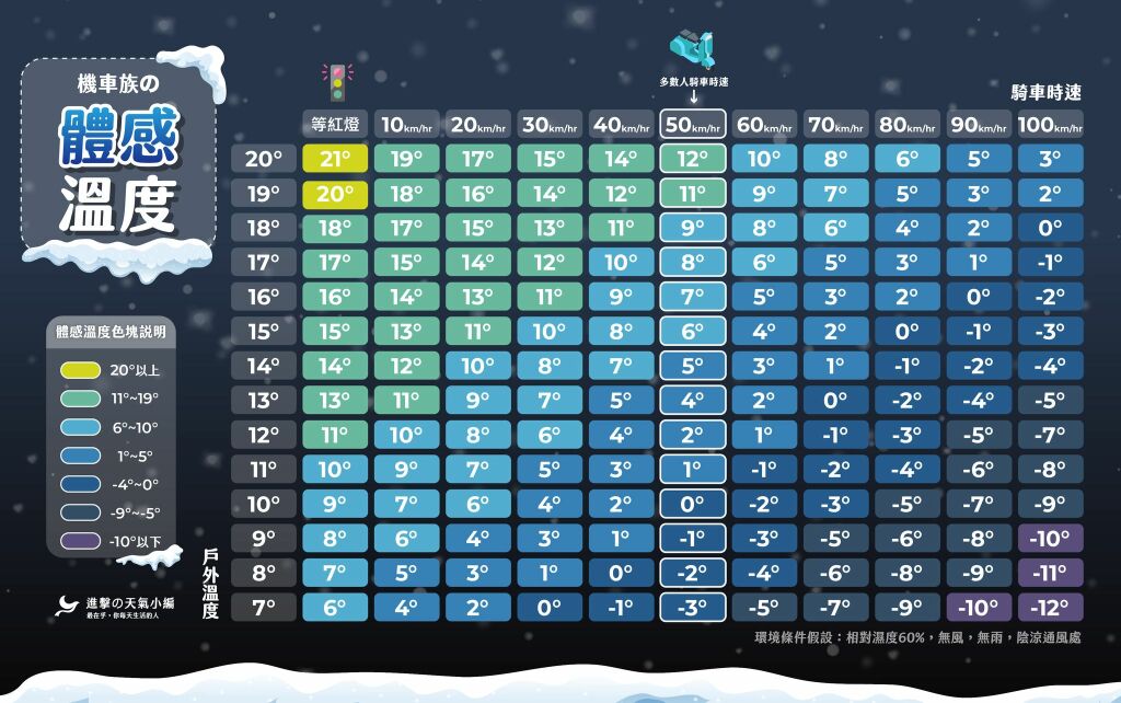 而氣象粉專「進擊の天氣小編」也發文分享,在風大的環境下,皮膚被帶走的熱量更多,這也是為什麼機車族的感受會比實際氣溫還要低,而小編也舉例,假設戶外溫度10°C,在相對濕度為60%、無風無雨的路上,騎車時速若在50km/hr,直接與空氣接觸的皮膚,像是沒戴手套的手和露出來臉部、頸部等部位,就感覺像是0°C一樣,因此更要做好防寒準備。