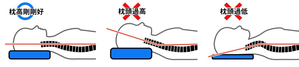 但怎麼知道枕頭高度適不適合自己?其實能從平常睡覺的角度看出一二。根據物理治療師謝劭玟的說明,如果頭部往下掉,就代表枕頭可能太低了,如果下巴與胸骨過近,則代表枕頭過高。至於正確的躺姿,應是頸椎與頭部呈一直線,習慣側躺的人則需確保側頸部有支撐,且鼻子與身體呈水平。