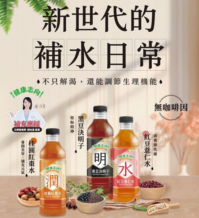 觀察到現代人對無咖啡因、低負擔的養生飲品需求,劉營養師說:「能不能有一款熱量低又有味道的水,最好還有機能健康概念?自己泡養生飲品挺麻煩的,如果能隨手買到一罐,不就便利多了!」於是她再次攜手全家健康志向補充應援,推出了「補水系列」,運用草本跟天然穀物開發三款無咖啡因飲品:紅豆薏仁水、黑豆決明子、桂圓紅棗水。希望能讓大家有更多喝水的新選擇,也讓不愛喝水的人,能因為好喝而更願意補充水分。