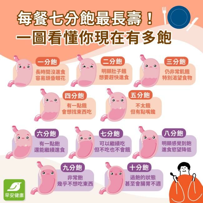 但是就算知道吃七分飽對身體好,我們的肚子卻沒有刻度可以判斷,到底怎麼樣才算是七分飽?其實我們可以透過身體的感覺來判斷: