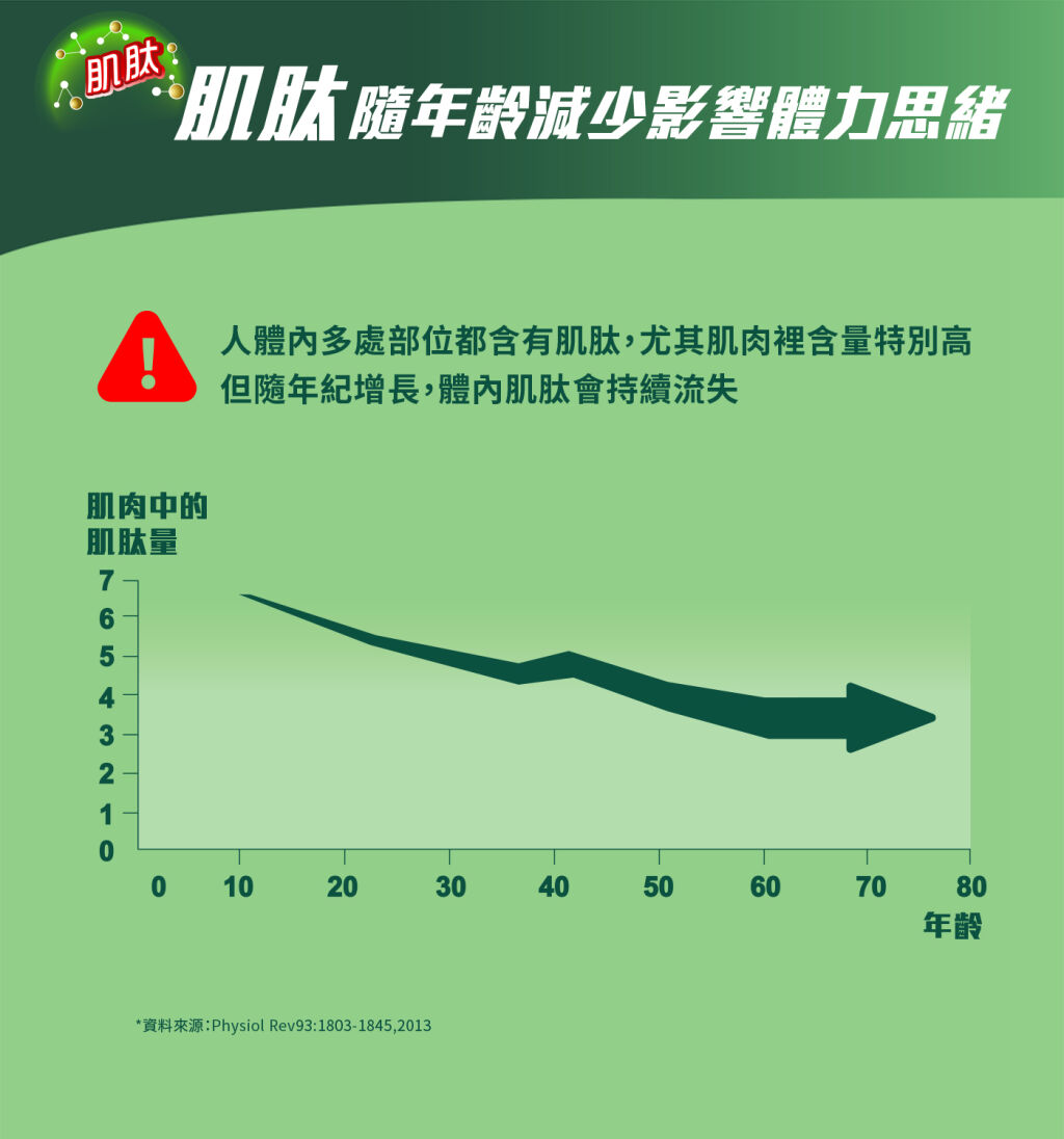 不過,體內的肌肽含量會隨著年齡增長而逐漸減少,且是每天24小時都在消耗,因此每天補充肌肽、讓身體能夠持續擁有肌肽存量很重要,擁有充足的肌肽能幫助你有效支撐日常所需體力進而維持思緒清晰。