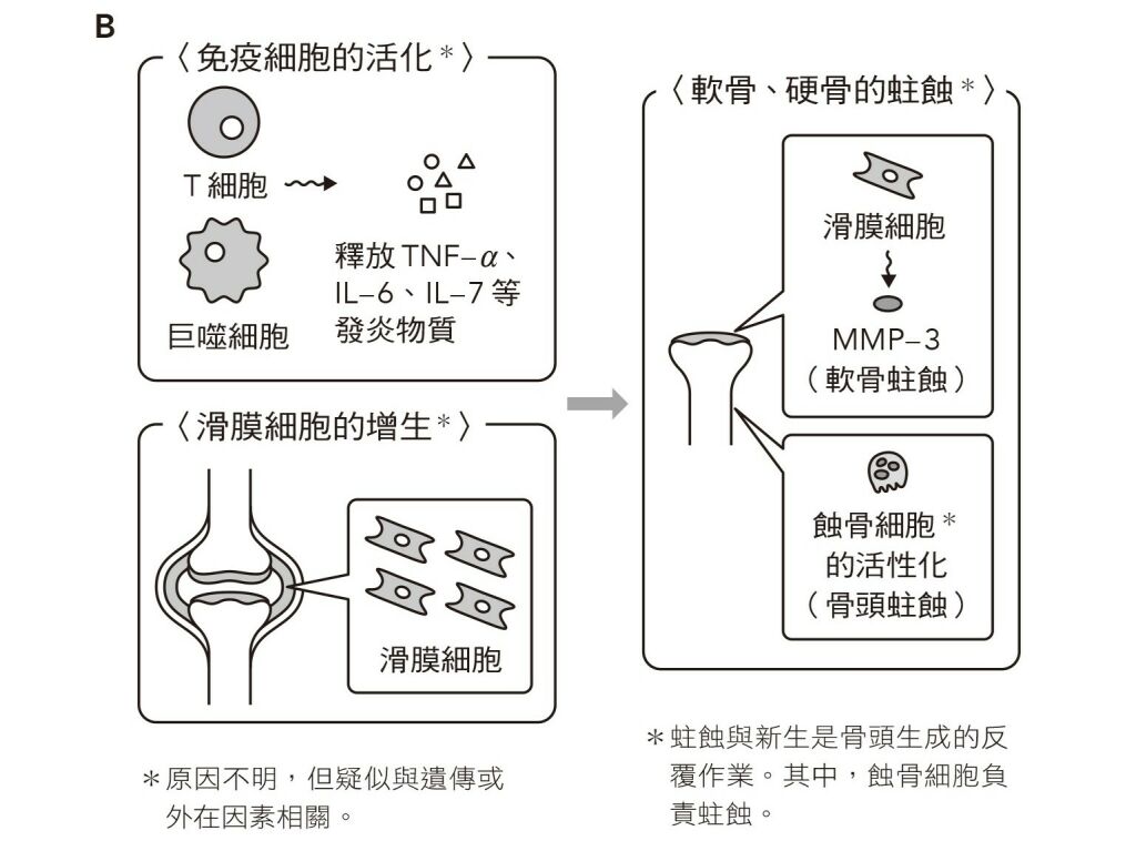其中,滑膜細胞會分泌一種可分解蛋白質的酵素,稱為「基質金屬蛋白酶−3」(Matrix metalloproteinase−3,簡稱MMP−3),它是破壞軟骨的主因;另一方面,負責破壞骨頭的,是一種叫做蝕骨細胞的免疫細胞,它們在病程中被過度活化。