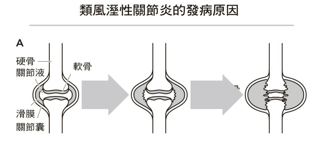 這個疾病詭異之處,在於關節內的滑膜(Synovial membrane)受到免疫系統的活化,產生發炎反應。滑膜是用來分泌關節液並提供營養,以幫助關節順暢運動的組織。當滑膜發炎、異常增生並腫脹時,就會引發關節的異常。之後,滑膜最終會侵蝕軟骨和骨骼。