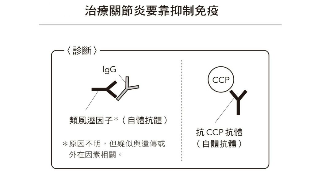 類風濕性關節炎屬於自體免疫疾病,自然是因為自體抗體的緣故。事實上,科學家早在1948年就發現類風濕因子(Rheumatoid Factor,簡稱RF),這是針對IgG抗體下半部(Y字型下方)所產生的自體抗體。