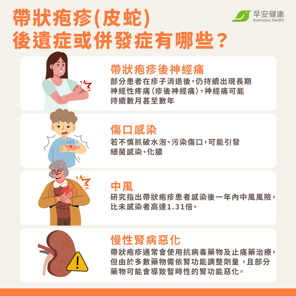 - 慢性腎病惡化:臺北醫學大學附設醫院腎臟內科醫師吳逸文醫師提醒,腎友罹患帶狀疱疹後,通常會使用抗病毒藥物及止痛藥來治療,由於多數抗病毒藥物需依腎功能調整劑量 ,且部分藥物(如 acyclovir)可能會導致暫時性的腎功能惡化 ,因此腎功能較弱的患者應特別留意用藥劑量與併用藥物。