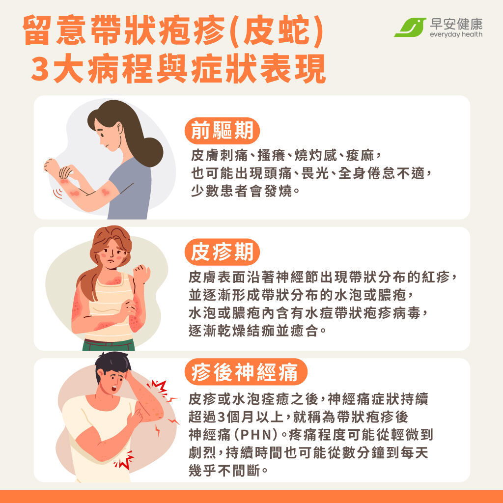 ▲認識皮蛇的三種病程變化明顯,及早辨識,及早察覺症狀,才能更快獲得妥善治療。