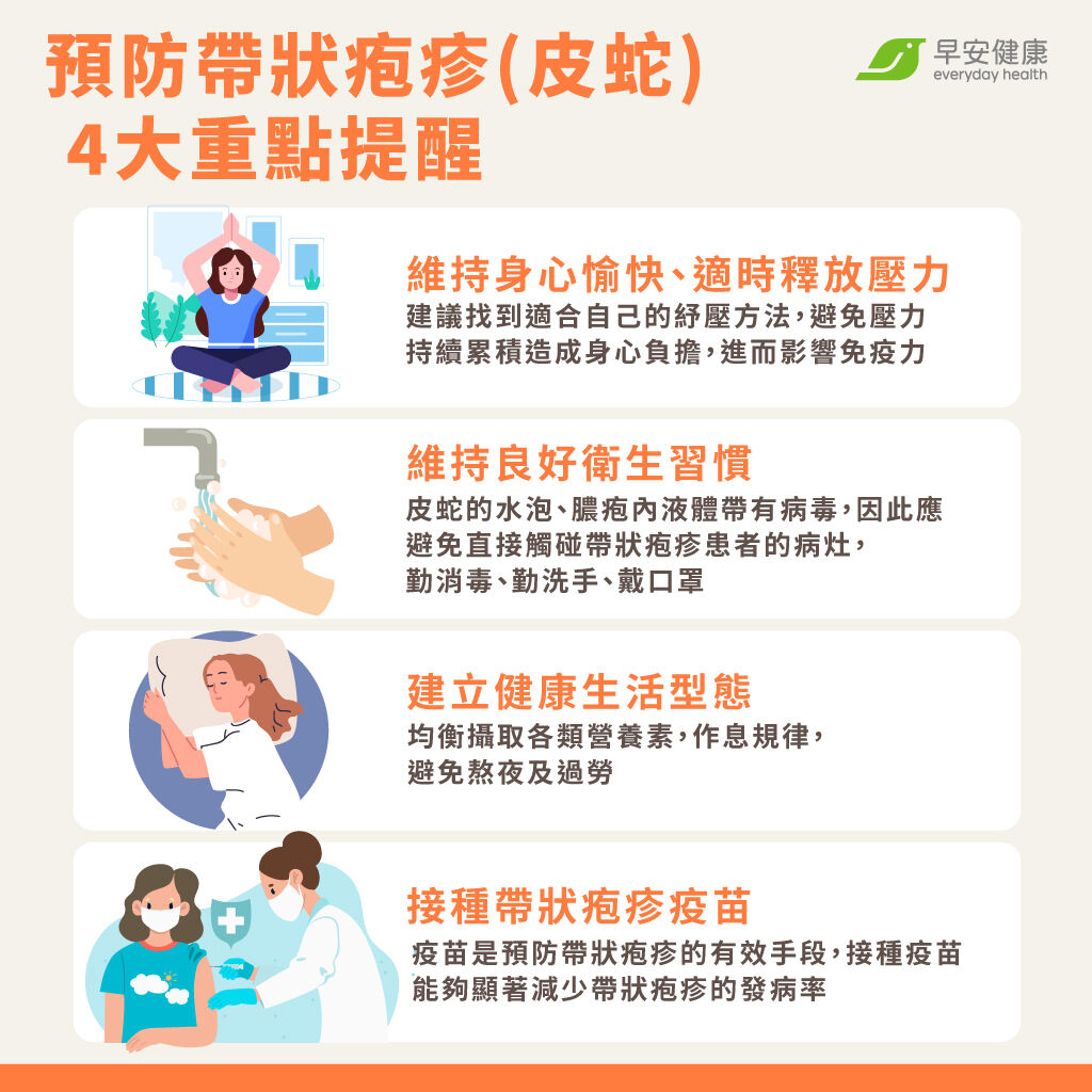 為避免帶狀疱疹重創健康,建議採取綜合性預防措施,包括均衡飲食、充足睡眠、有效紓壓,並與醫師討論是否適合接種帶狀疱疹疫苗,以預防帶狀疱疹。