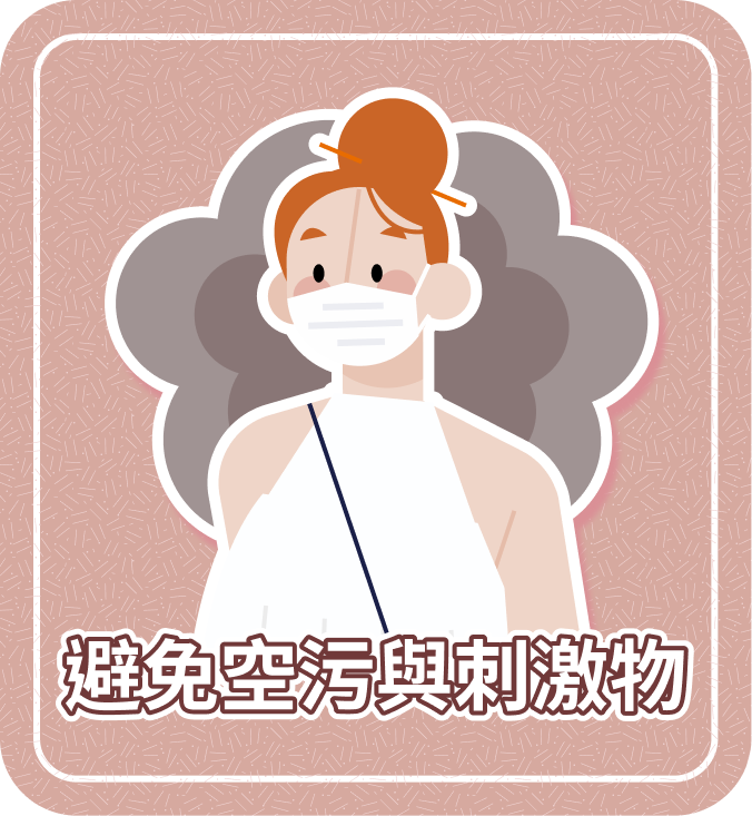 空氣品質不佳時戴口罩,避免二手煙、油煙與化學氣體,室內保持通風。