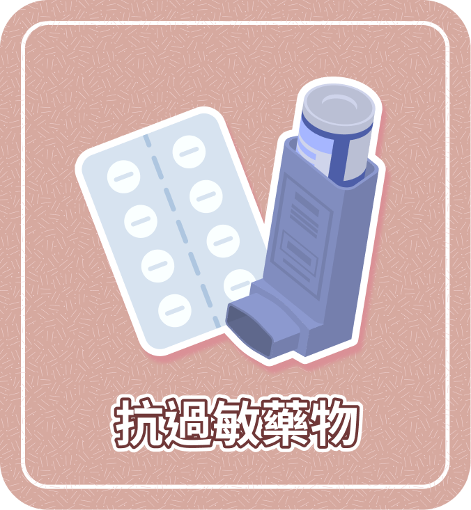 過敏發作時服用抗組織胺,氣喘患者攜帶吸入劑,嚴重者備妥腎上腺素針劑。