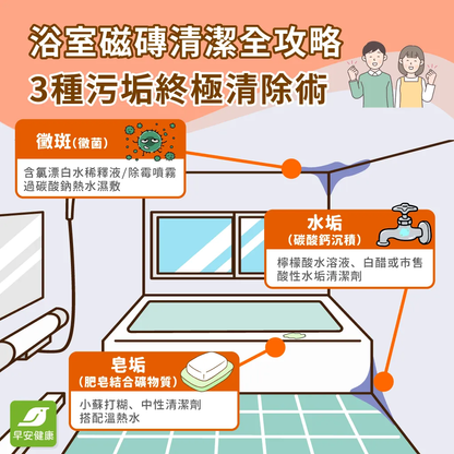 浴室磁磚發霉刷不掉?矽利康長黑斑怎麼辦?早安健康獨家整理2026最強浴室磁磚清潔攻略,輕鬆去除表面的霉斑、水垢,還你光亮潔淨的浴室空間。
