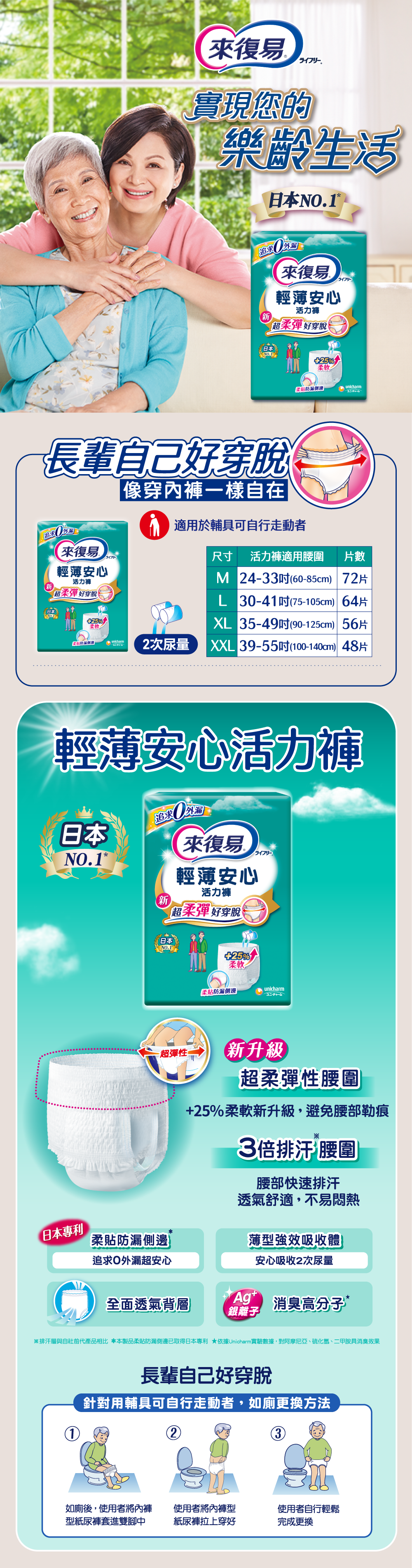 長時間外出時,最怕找不到廁所,或是偶爾大笑、打噴嚏意外出現漏尿的尷尬狀況,有了 來復易 輕薄安心活力褲 後,外出時感覺可以很安心、放心,除了穿脫方便、透氣、容易更換外,還有超柔彈性腰圍,不會產生勒痕,無論跑跑蹦活動起來也很舒適、不卡卡。 最令人喜歡的是有特別添加Ag+消臭高分子,完全不用擔心產生異味,可以時時刻刻安心、放心,不需要再心急尋找廁所,或是擔心意外尷尬狀況發生,讓我在居家、外出時都能時刻清爽又自在!