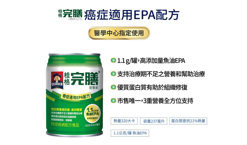 *桂格完膳癌症適用EPA配方屬於特殊疾病配方食品,不適合一般人食用,需經醫師或營養師指示使用