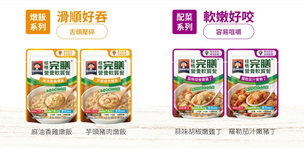 因此也可以搭配桂格完膳推出的「營養軟質餐」,像料理包一樣,有肉、有菜、有主食,質地柔軟、滑順好吞、質地柔軟,特別適合吞嚥困難、食慾小的人。葉心理師分享自己吃過「羅勒番茄豬肉丁」口味,大讚非常好吃,甚至會能搭配軟法麵包切片烤一烤沾著吃,笑稱很像西餐廳料理。