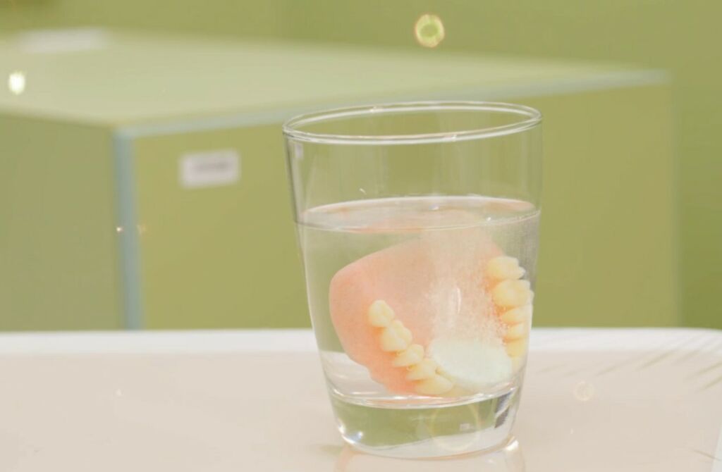 醫師建議正確的假牙清潔方式是每日睡前取下假牙,以專用軟毛牙刷沾清水清潔,並搭配假牙專用清潔錠浸泡,幫助殺菌且去除假牙上殘渣,降低細菌再附著能力,使假牙表面較不易汙損,更確保口腔健康。