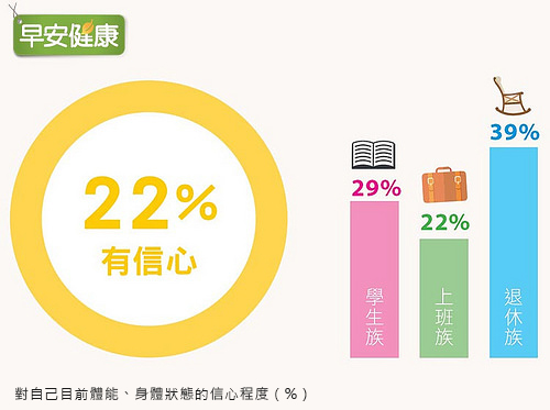 調查指出,原本應是年富力壯的中壯年上班族對健康最沒信心,以22%墊底;反觀退休族最有自信,以39%居冠,顯示在經濟與時間較有餘裕的情況下,退休族已成為社會的健康行動派,為身體健康做足了準備!