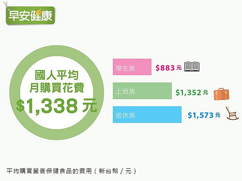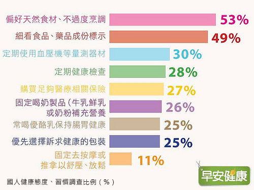 納入一般人認為代表健康的行為習慣,結果指出偏好天然食材為首位,顯示國人對飲食健康與對食品安全的重視。但在定期健康檢查與購買健康保險方面,則顯示出國人的關心程度較低。另外,根據2015年一項尼爾森所做的媒體大調查,僅有不到3成受訪者有時常運動保持健康與身材的習慣,顯示國人對於健康的行動力仍有待加強。若分論年齡階段,退休族高達50%有健康檢查習慣,領先其他族群。