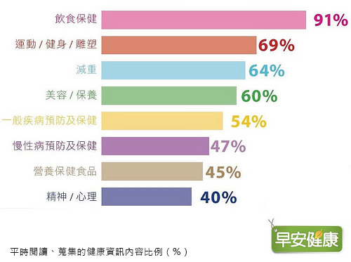 飲食保健議題,在食安狀況頻傳的近幾年更是國人關心的焦點,國人主動閱讀及搜尋的比例高達91%。而健身、減重與美容等更是永遠的不敗話題,一口氣包辦了搜尋排行榜的第2、3、4名。