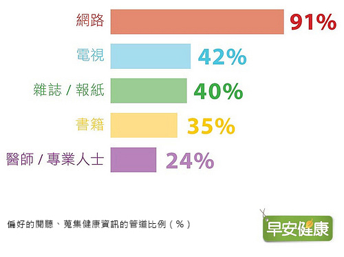 網路以91%的偏好比例遙遙領先其他閱聽管道,顯示當遇到身體不適或有相關保健方面的需求時,民眾最習慣透過網路獲取健康資訊。也顯示當高齡化與網路時代全面到來,正確、專業性強卻更淺顯易讀的健康資訊,將是未來網路瀏覽者最迫切的需求所在。 另一調查也呼應了此項結果,前6名「閱讀健康資訊後最常做的活動」全都與網路有關。按讚、分享、文章收藏、轉貼更已成為好友間維繫情感與溝通的新習慣。