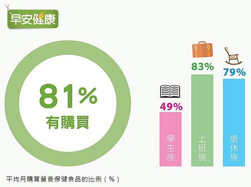 身為社會與家庭中流砥柱的上班族,心繫健康卻難以付諸實踐,因而成為本次調查的「虛累累」一族。虛累累的上班族也以83%成為購買營養保健食品比例最高的族群。另外,學生族群中也有49%有固定購買保健品的習慣,主要是以大考前的維他命補充為主。