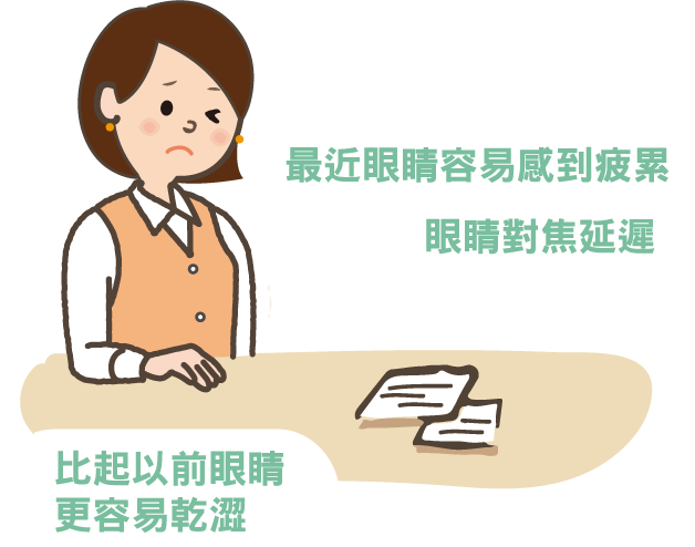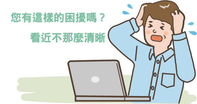 1.要看近的時候覺得文字模糊,要拿遠一些才能看清楚。長時間近距離工作時,眼睛也比以前更容易疲勞、乾澀、甚至於會頭痛。
